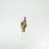 Πρόκειται για μία μεγάλη λιλά Πασχαλινή Λαμπάδα 30x3x2.5 εκ. διακοσμημένη με πέρλες, πολύχρωμο ύφασμα και κορδόνι με χρυσές λεπτομέρειες, που δένουν ιδανικά με τα χρώματα της σύνθεσης.